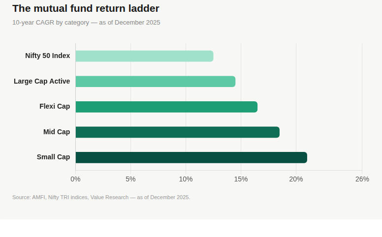 Actively managed funds have pushed those baseline averages even higher. Well-regarded large and flexi-cap funds historically hover in the 14% to 16% annualized range. If you were willing to stomach more volatility and allocate capital to top-tier small-cap funds, the 10-year historical averages often sit between 18% and 22%.
