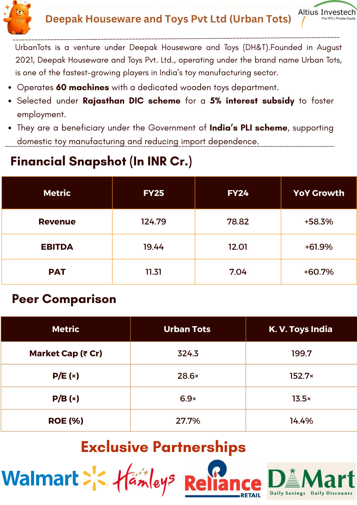 - We at Altius Investech have many actively traded scripts and are market makers of unlisted shares. To check out all the unlisted shares traded. (Click on link). To submit a request to buy Deepak Houseware and Toys Private Ltd. (Urban Tots), please click on the trade button at the top of this page